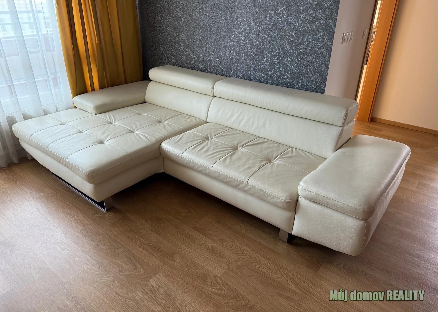 Obývací pokoj s kvalitní koženou sedací soupravou, propojený s jídelní částí a kuchyní.