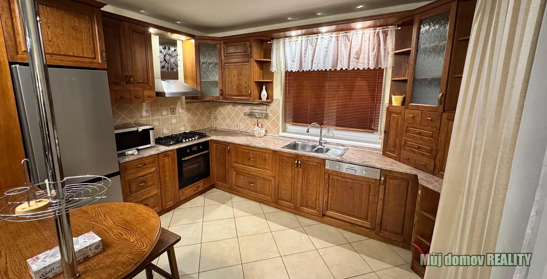 plně vybavená kuchyň (lednice, myčka, plynový sporák, elektrická trouba, digestoř, barový pult)